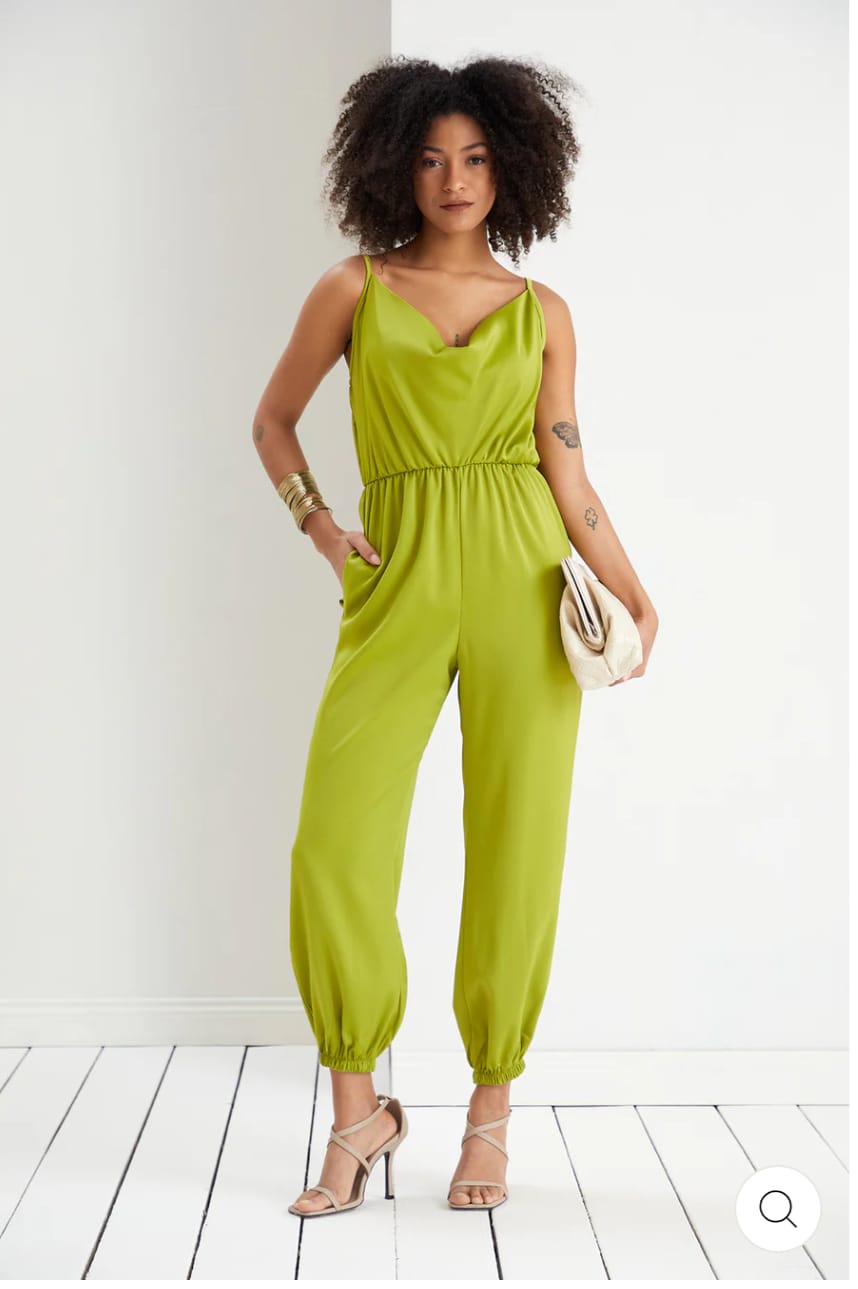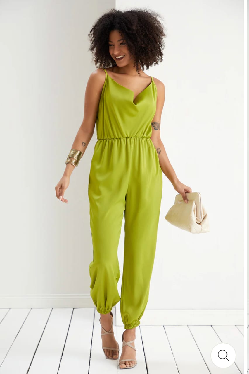 Cette combinaison verte éblouissante est idéale pour les occasions spéciales. Confectionnée en tissu léger, elle offre un ajustement confortable avec une taille élastique. Les bretelles fines et le décolleté subliment le look. Parfaite pour un style à la fois élégant et décontracté !